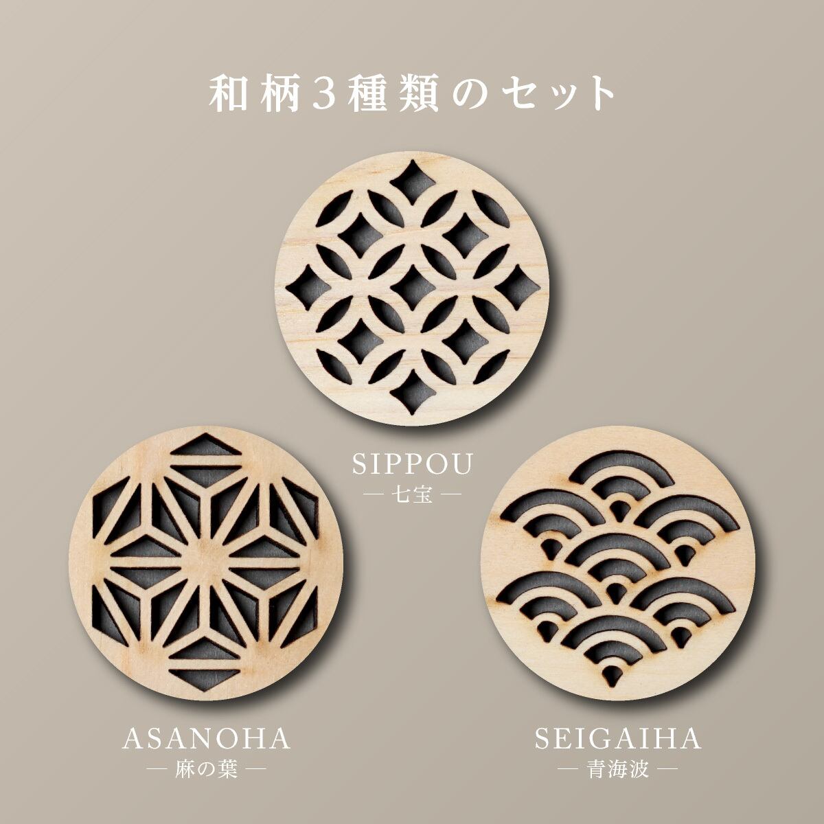繊細な透かし彫りで、伝統的な和柄「七宝・麻の葉・青海波・矢羽・桜」をあしらいました。