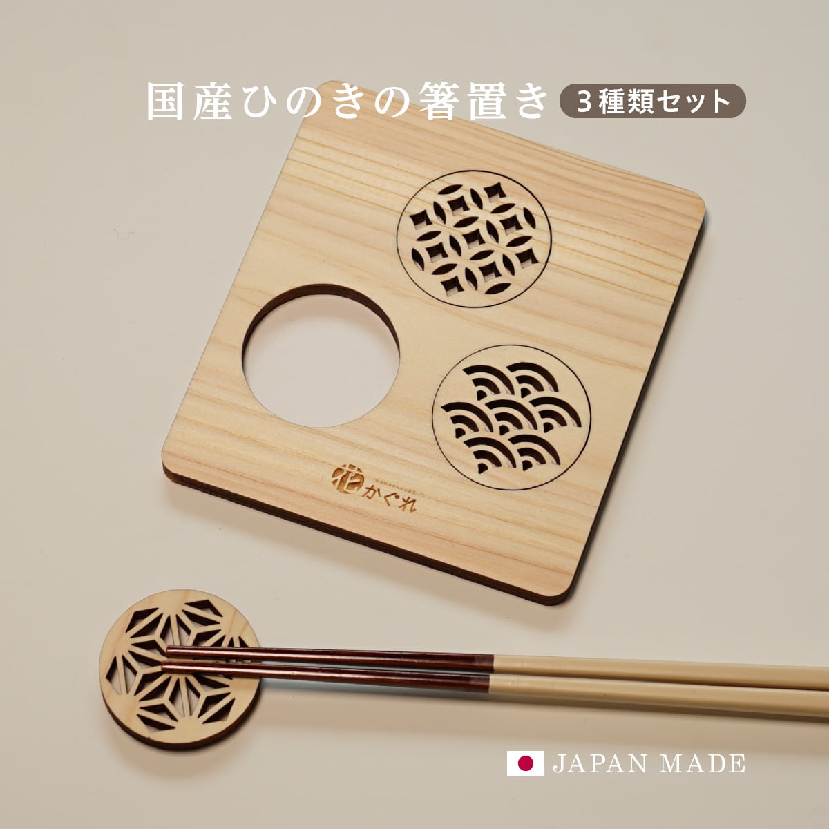 ひのきの箸置き 3枚セット 木製 日本製 国産 檜 ヒノキ 和柄 七宝 麻の葉 青海波 母の日 父の日 海外 外国人 プレゼント
