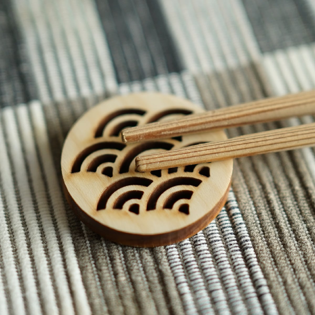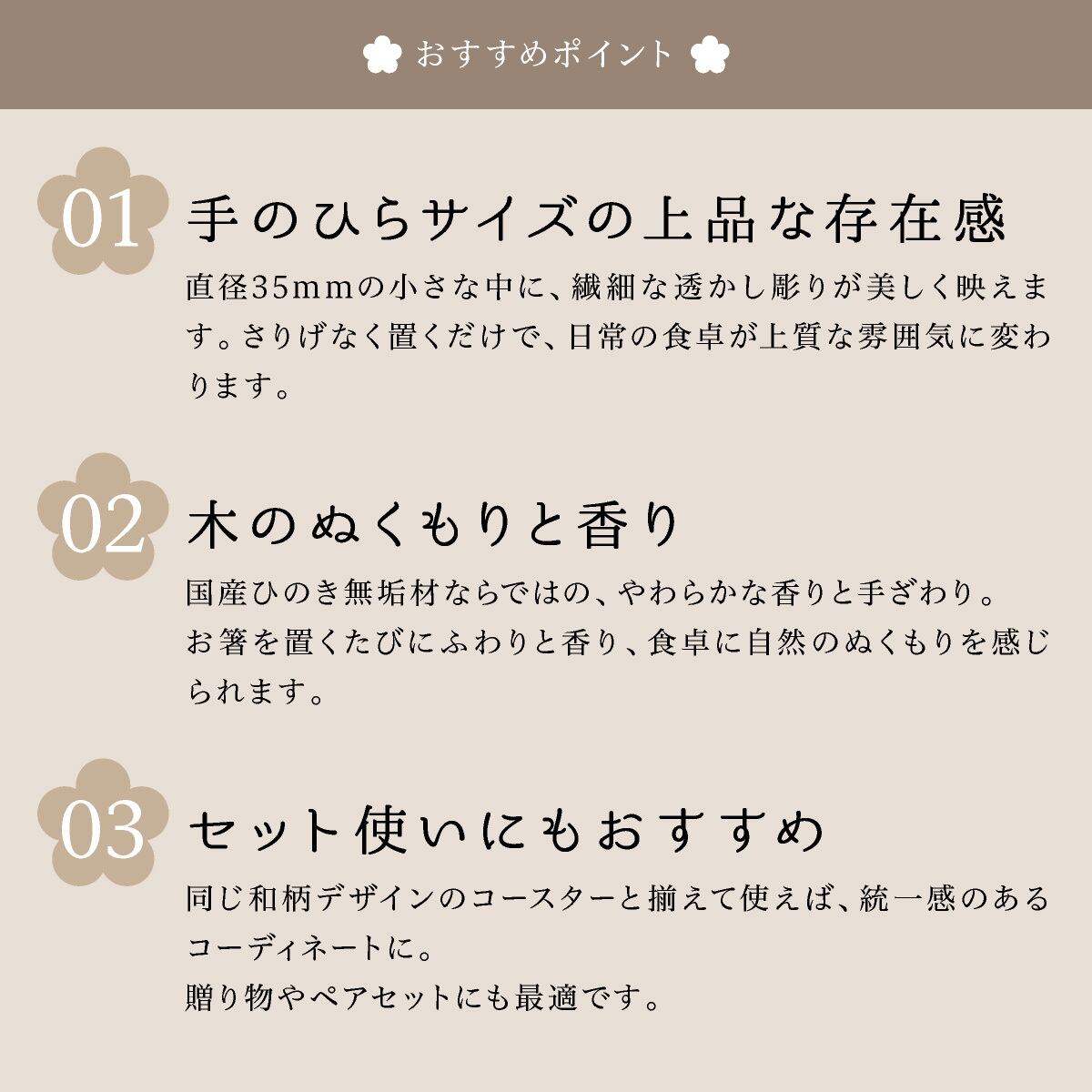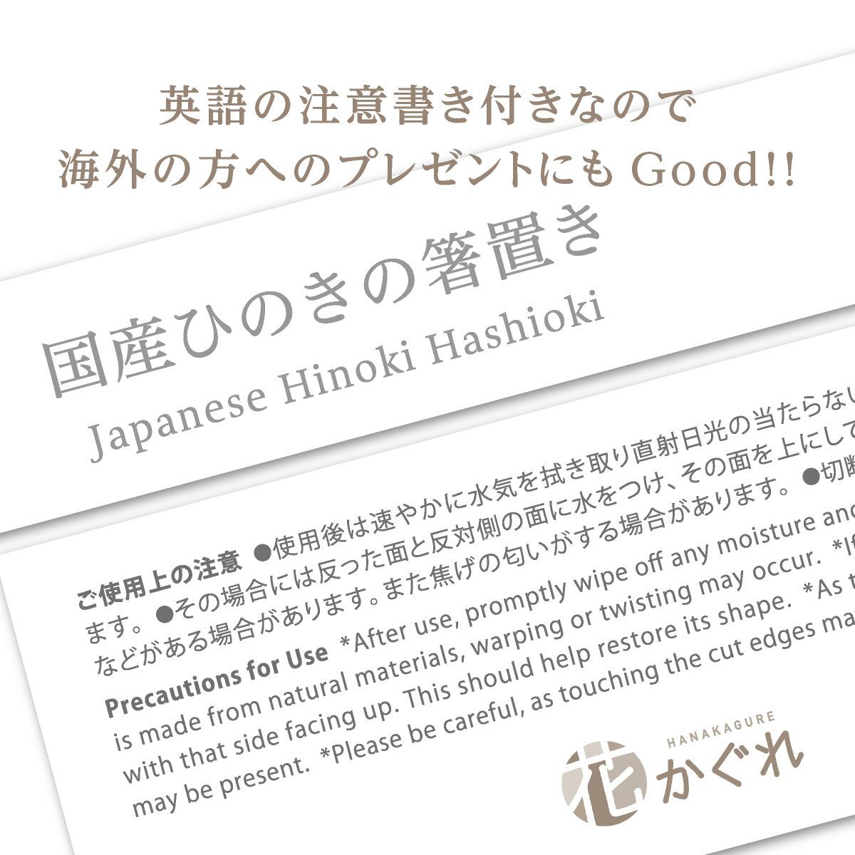 国産ひのき無垢材を使用した、やさしい香りと和の趣が楽しめる箸置きです。