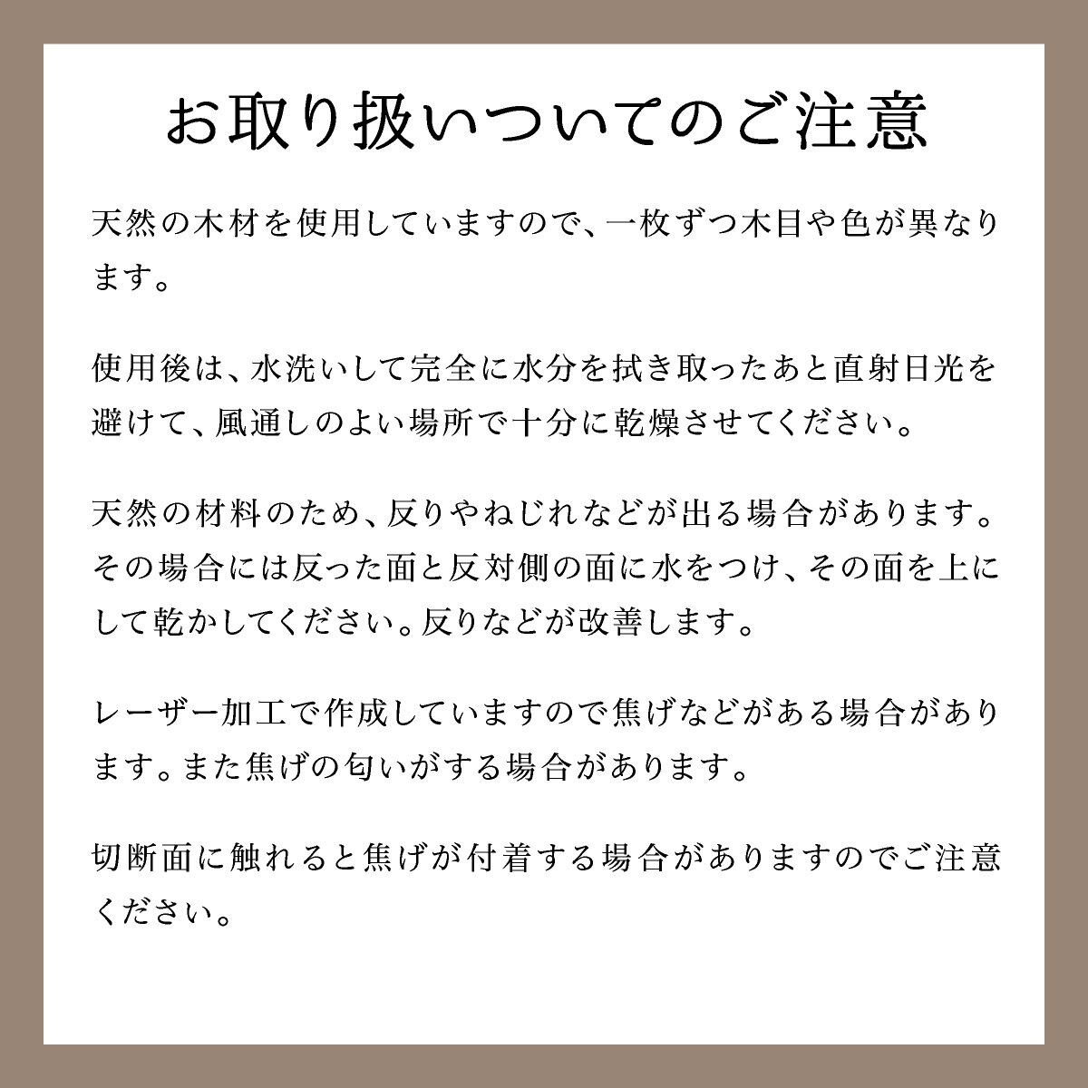 レーザー加工で作成していますので焦げなどがある場合があります。また焦げの匂いがする場合があります。